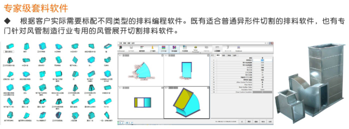 特別針對通風管道行業專門用于切割2mm以下的薄、中碳鋼板、 不銹鋼板、鋁板、銅板、鍍鋅板、白鐵皮、合金板等多種板材材料,快速風管激光切割機,效果佳、無掛渣和毛刺;AutoCAD繪圖軟件直接用于繪制圖形,不需轉換,直接切割,并可進行簡單的排料,工件共邊設置,購買本公司此款設備可享受免費送貨上門、安裝調試及培訓、包教包會!